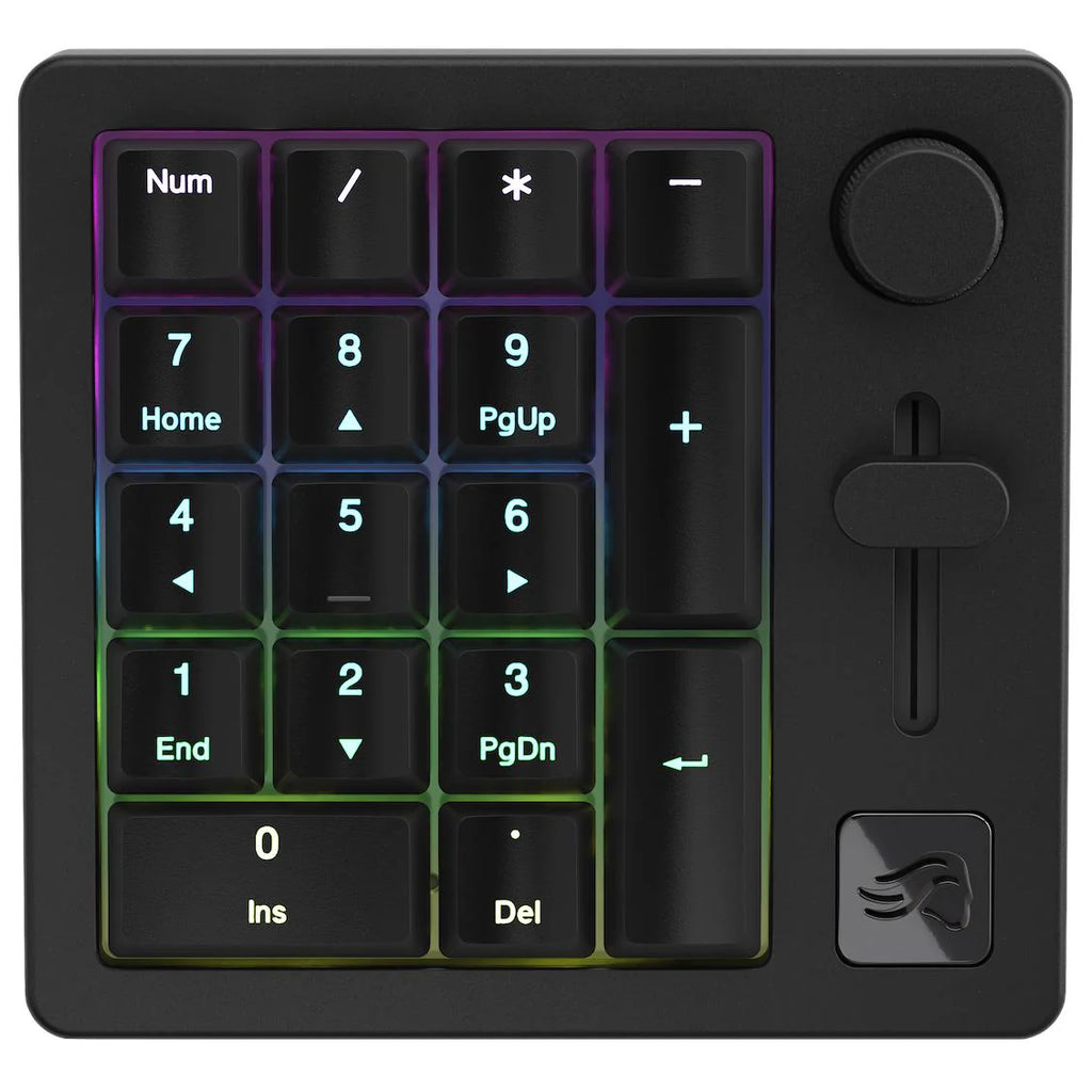 Its high-quality build features a sleek aluminum body, a gasket-mounted plate, and sound dampening foam for satisfying acoustics. The Numpad also boasts vibrant RGB side lighting and per-key illumination.