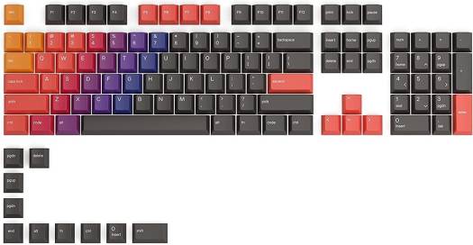 The caps are colour-intensive and opaque. For illuminated keyboards, this provides a nice illumination of the underside of the keycaps. The lettering is durable and abrasion-resistant due to the dye-sublimated production process. The keycaps form a colour gradient from orange through red, purple and blue to black.