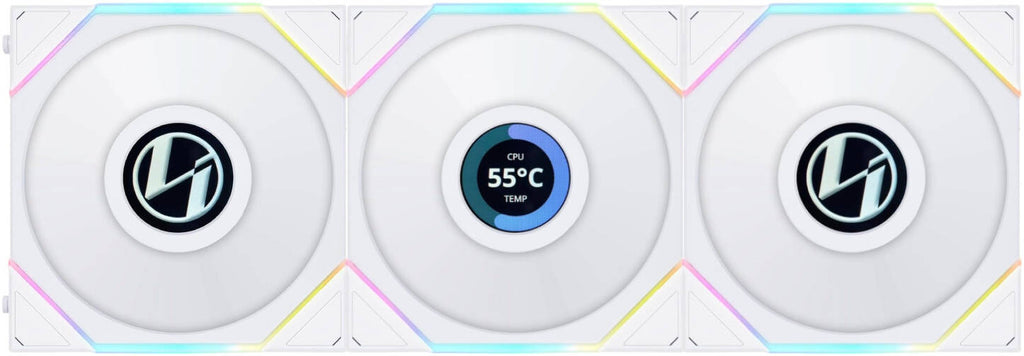 Lian Li Uni Fan TL 120 Case Fan, 1.6” LCD, 120mm Fan Size, 1900 RPM Fan Speed, 62 CFM Airflow, PA66 / PBT Materials, Fluid Dynamic Bearing, Triple Pack, W/ Controller, White | G99.12TLLCD3W.00